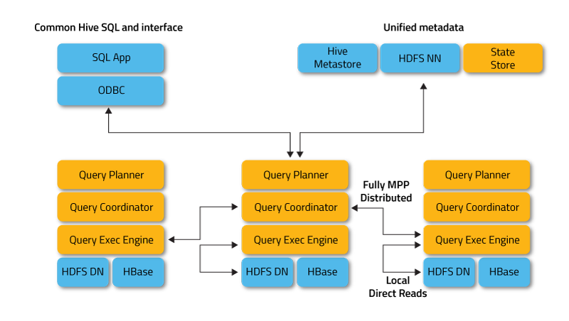 하둡이나 클라우드 스토리지에 저장된 대용량 데이터셋에 대한 고속, 대화형 SQL 쿼리를 목적으로 설계