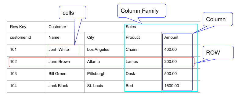 로우 키: Cell의 논리적인 그룹인 로우row를 정의함컬럼 패밀리: 메모리와 디스크에 분리되어 저장되고, 컬럼 한정자로 세분화되는데 하나의 로우에 수백만 개의 컬럼 한정자가 있을 수 있음.
